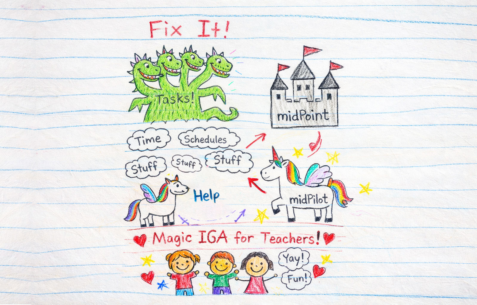 The challenges they faced weren’t just small inconveniences – they were a fearsome multi-headed dragon of tasks: one head for schedules, one for attendance, one for supplies, and even one that consumed story time itself. With its magical AI powers, midPilot could swiftly connect all the classroom systems to midPoint – the central castle of the magical kingdom that managed all the teachers – organizing schedules, tracking supplies, and even whispering reminders about who needed extra attention that day. Together, midPoint and midPilot promised to slay the dragon, banish tedious tasks, and restore order to the kingdom, leaving teachers free to focus on the children and ensuring that no story time would ever be cut short again.